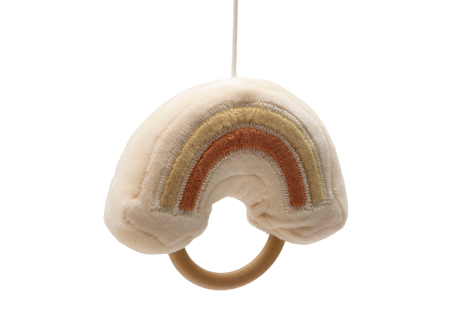 Befestigen Sie das Mobile am Rand des Laufstalls für extra Spielspaß oder am Bettchen für ein sanftes Einschlafritual. An dem Holzring hängen zwei Kängurus, eine fröhliche Sonne und ein bunter Regenbogen – alles weiche Figuren, die Ihr Baby zum Schauen und Entdecken einladen.