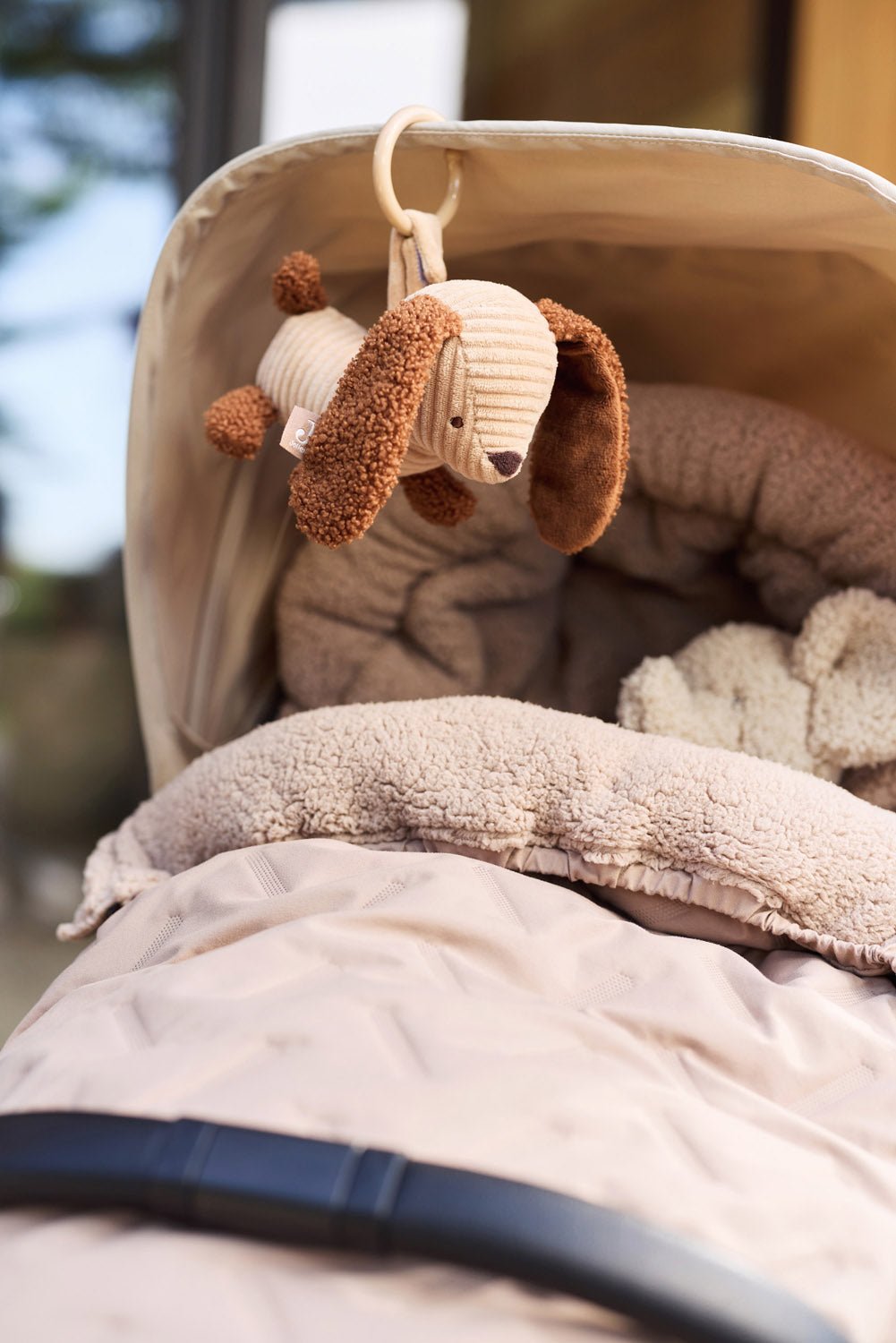 Kinderwagen-Anhänger Diego Dog Dieser niedliche Kinderwagen-Anhänger Diego Dog ist aus weichem Rippstoff in der Farbe Biscuit gefertigt und verfügt über verspielte Bouclé-Details in Leather Brown. Der Kunststoffring ermöglicht eine einfache Befestigung am Kinderwagen. Mit seinen gestickten Augen und der Stoffnase ist er der perfekte Begleiter für deinen Schatz unterwegs!
