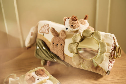 Dieses weiche Aktivitätsbuch aus der Tiny Park Kollektion wurde speziell entwickelt, um die Sinne deines Babys zu stimulieren. Das Buch besteht aus vier Seiten, jede mit einem niedlichen Tiermotiv wie einem Hasen, Vogel, einer Ente oder einem Schwan. Die Seiten enthalten knisternde Materialien, die zum Entdecken und Spielen einladen. Ein Spiegel und kleine Bäumchen auf den Seiten machen das Buch noch spannender. Ein perfektes Spielzeug zur Förderung der Sinne und der Motorik deines Babys!