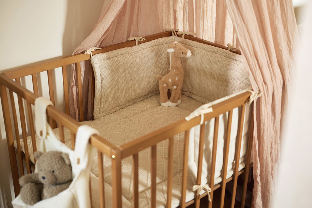 Our Check Knit theme consists of great items made of wonderfully soft knitted fabric with a diamond pattern. The items in this collection have beautiful beige shades such as Biscuit and Oatmeal. Get these awesome checked items and choose between storage baskets, playpen rugs, footmuffs, blankets and bed bumpers. Due to the number of items, you can implement this theme throughout the entire nursery. We love this beautiful luxurious fabric in the most beautiful neutral colours! Are you already a fan of these cuddly items?