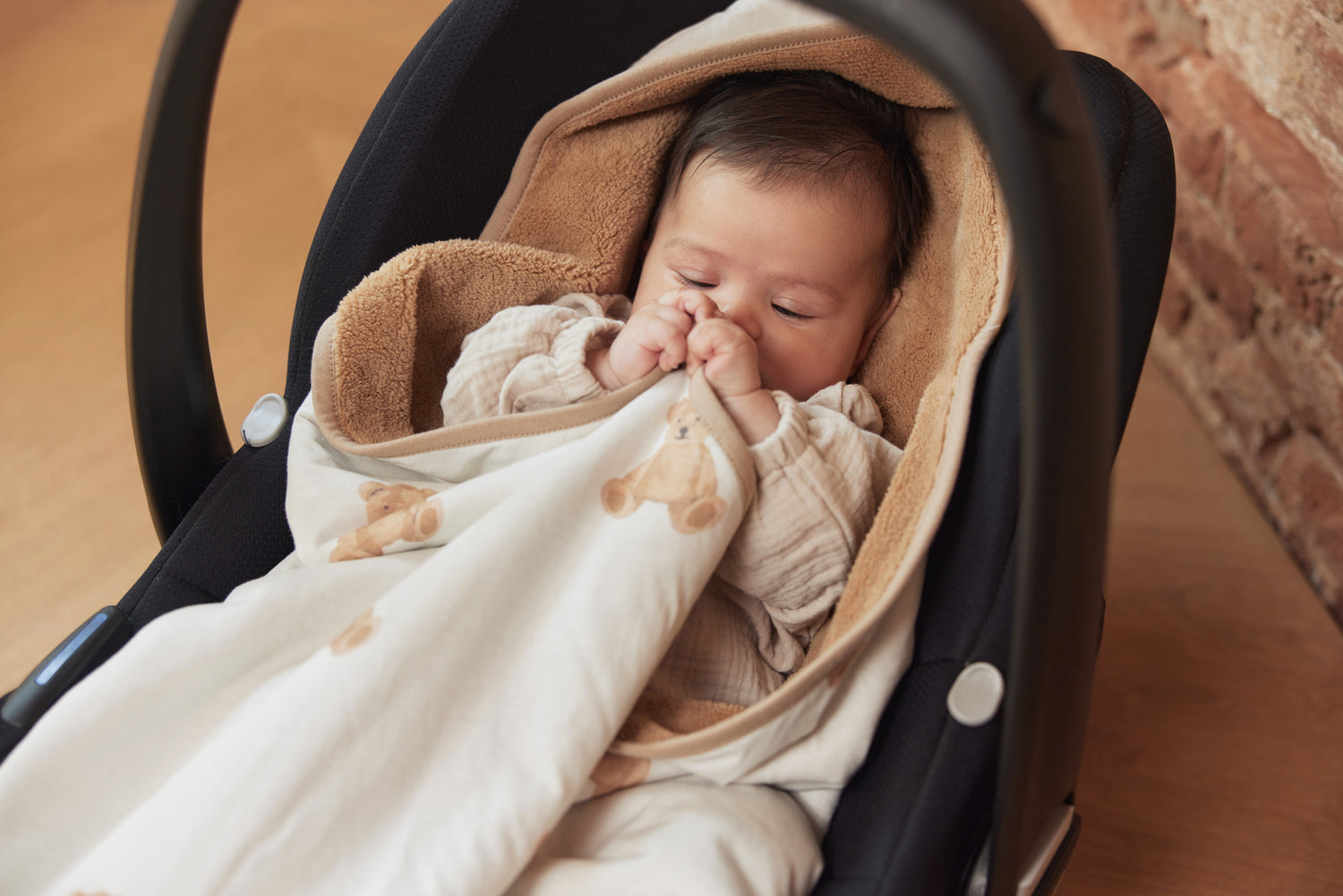 Wrap blanket with guaranteed mega cuteness factor. It has fluffy fur-look fabric on the outside, and it's super comfortably soft on the inside. Wrap your baby up and close the blanket with the practical velcro strips. Put the little hat on, with adorable little ears and a little bear face. Too cute! This wrap blanket can be used from birth. And it's also practical to use in your baby's first car seat. You can put the belts of the car seat through the openings in the blanket, so your baby can stay in their wrap. It's a universal wrap blanket for the Maxi Cosi and every other brand of category 0 cat seat with three or five point seatbelts. Available in various colours.