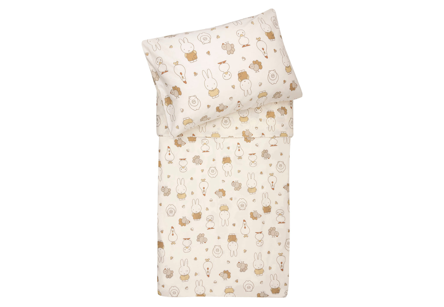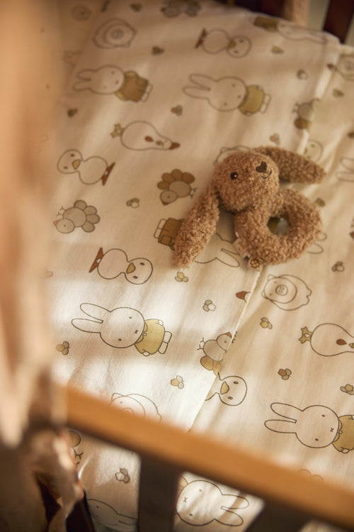 Laat je kleintje heerlijk dromen onder dit schattige dekbedovertrek uit de Miffy Family Farm collectie. De all-over print toont Miffy en haar boerderijvriendjes op een zachte oatmeal ondergrond, wat het geheel een rustige en lieve uitstraling geeft. Zowel het dekbedovertrek als de bijpassende sloop hebben aan beide kanten dezelfde lieve print.