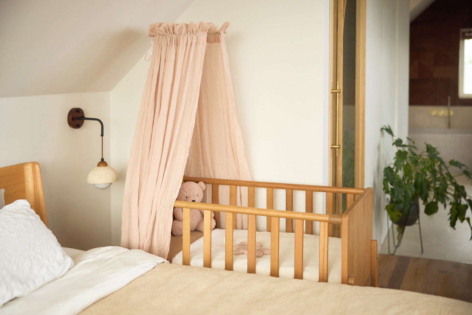 Nous voilà de retour dans notre nouvelle collection : le voile vintage ! Un voile transforme le lit de bébé en un endroit douillet pour dormir. Et vous verrez : une fois accroché le voile, la chambre de bébé sera parfaitement terminée. Il ajoute de l'ambiance et de la sécurité. Aecla perche assortie, vous pouvez facilement suspendre un voile de lit de bébé, sans avoir à percer le plafond ou le mur. Choisirez-vous ce magnifique voile dans la couleur Wild Rose ou Sea Green ? Ces deux couleurs s'accordent parfaitement avec les autres articles de notre collection et apportent une douce ambiance dans chaque chambre d'enfant.